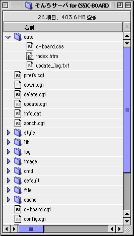 ぞんちブラが使うCGI及びデータファイルのみが含まれています。(SS)C-BOARDは、別途ご用意いただきインストールする必要があります。 |